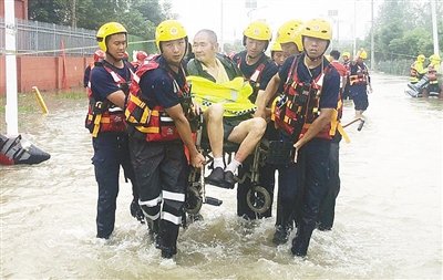 7月21日上午11時許,在安徽省六安市裕安區固鎮的一個衛生院內,洪水漫過院子不斷涌進樓內,造成大量病人被困。張洋博和隊友在三樓一個角落處搜救時,發現一名老人癱瘓在床。緊急情況下,在確保老人身體無恙之后,張洋博和隊友將老人抬上輪椅,將老人轉移到安全地帶。