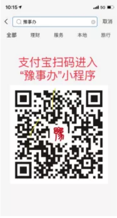 (1)打開支付寶,搜索“豫事辦”,或者掃描下方二維碼進入“豫事辦”小程序。