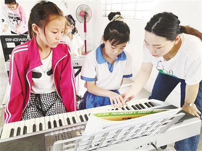 志愿者指導學生練習指法。