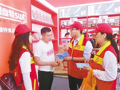 志愿者在食博會現場發放宣傳資料。