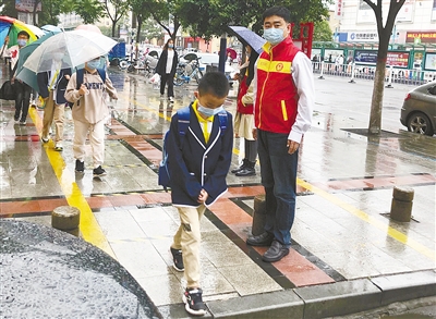 “路上小心,不要扎堆,注意間隔一米以上……”5月7日下午,天下著蒙蒙細雨,在源匯區受降路小學門口,身穿紅馬甲的馮濤不時提醒排隊放學的學生注意間隔距離。一些學生路過時,主動向馮濤問好、鞠躬。
